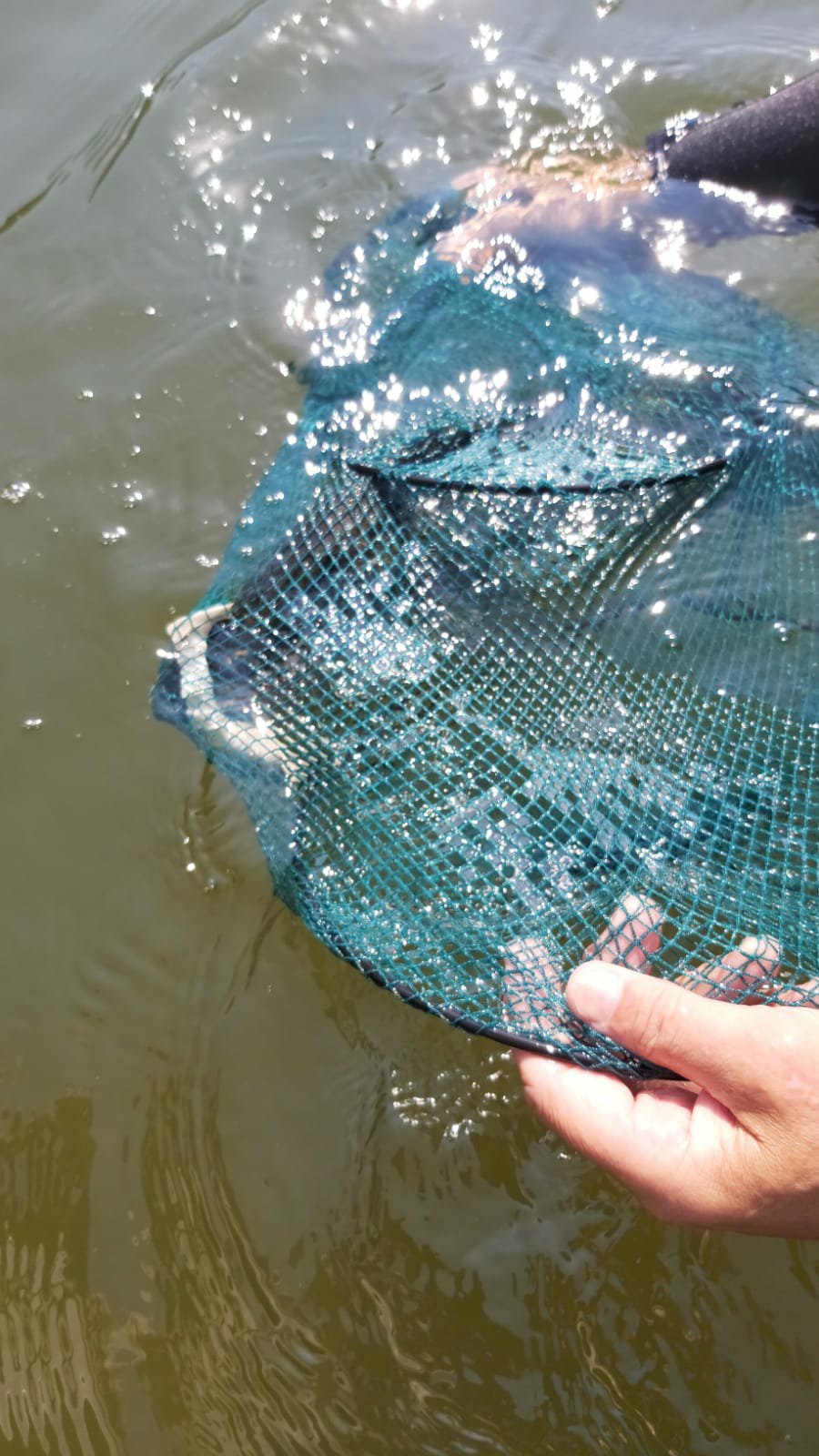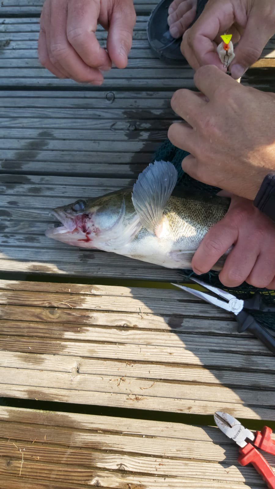 Mit einem Kecher ließ sich das scheinbar völlig erschöpfte Tier einfangen und an Land bringen. Vorsichtig entfernte man dort das Lockmittel des Anglers und setzte den Zander behutsam, und mit besten Genesungswünschen 😉, zurück ins Wasser.